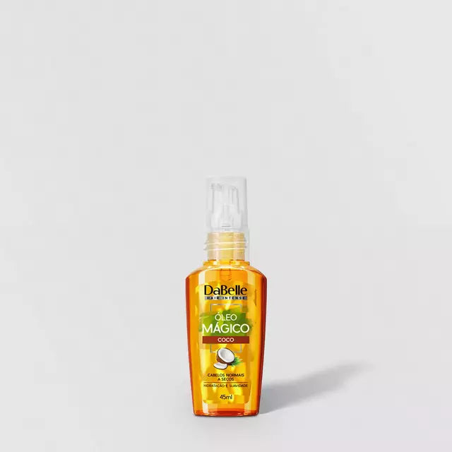 DaBelle Óleo Coco 45ml - Óleo Mágico é o segredo para cabelos hidratados, nutridos e radiantes. Extraído do coco, este óleo natural age profundamente na fibra capilar, promovendo hidratação intensa e nutrição poderosa para todos os tipos de cabelo. Com sua fórmula leve, ele ajuda a controlar o frizz, proporciona brilho intenso e deixa os fios macios ao toque.