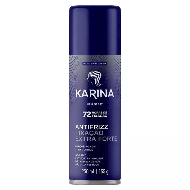 O QUE VOCÊ PRECISA SABER O Hair Spray Karina Antifrizz Fixação Extra Forte é o aliado perfeito para quem deseja manter o penteado impecável durante todo o dia. Sua fórmula exclusiva combate o frizz, garantindo cabelos alinhados e protegidos contra a umidade.